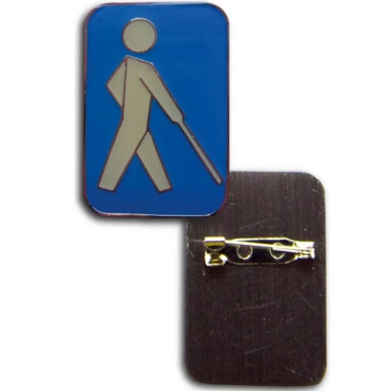Blindenplakette eckig, blau mit weißem Stockmännchen (Anstecknadel)