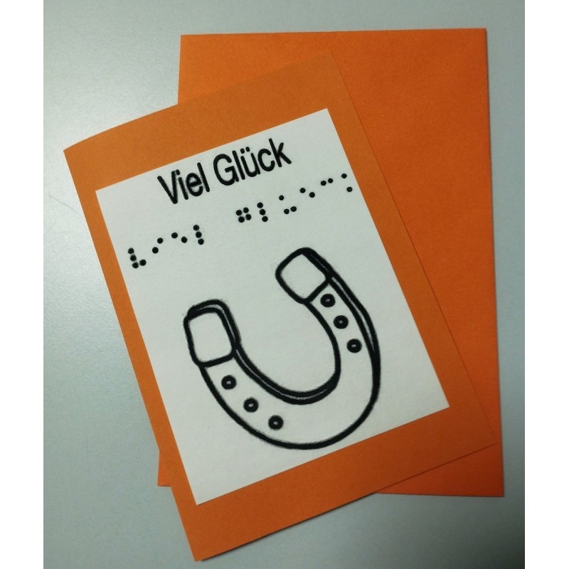 Text: "Viel Glück" Inklusive, taktile Grußkarte in schwarz auf weiß, mit farbigem Hintergrund und passendem Briefumschlag. Die Beschriftung ist sowohl in Schwarz- wie auch in Blindenschrift aufgebracht. Klappkarte Format A6